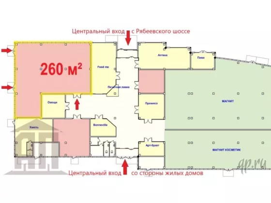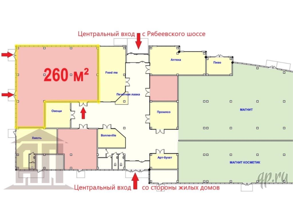 Удобное расположение новый ТЦ построен на въезде в жилой массив микрорайона Мигалово. Высокий автомобильный трафик по Рябеевскому шоссе. В ТЦ успешно работают и активно посещаются Супермаркет Магнит и торговые точки товаров повседневного спроса. В шаговой доступности расположены остановки общественного транспорта, а так же излюбленное место массового отдыха горожан набережная реки Волга.