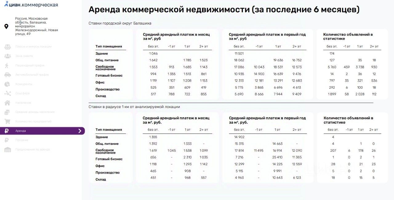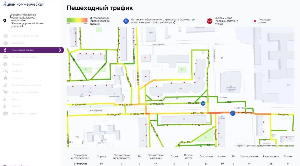 Собственник, сдача без комиссии! Идеально сетевых магазинов. Легкое производство, пищевое производство, салон красоты, стоматология поликлиника, образовательная деятельность и тд. Рядом есть 413 парковочных мест. Расстояние по прямой до ближайшей парковки - 23 м. Поблизости расположено 4 продуктовых магазина. Рядом есть 3 аптеки. Поблизости 9 пунктов выдачи заказов. Есть 1 алкомаркет. Плотность населения выше среднего - 7 349 домохозяйств в 10 мин пешком. Средняя плотность 6 884 (городской округ Балашиха). Рядом есть 3 остановки общественного транспорта. До ближайшей остановки общественного транспорта 58 м. Общее количество раз приезжающего на остановку общественного транспорта за сутки - 303. Рядом жд станция - 299 м.